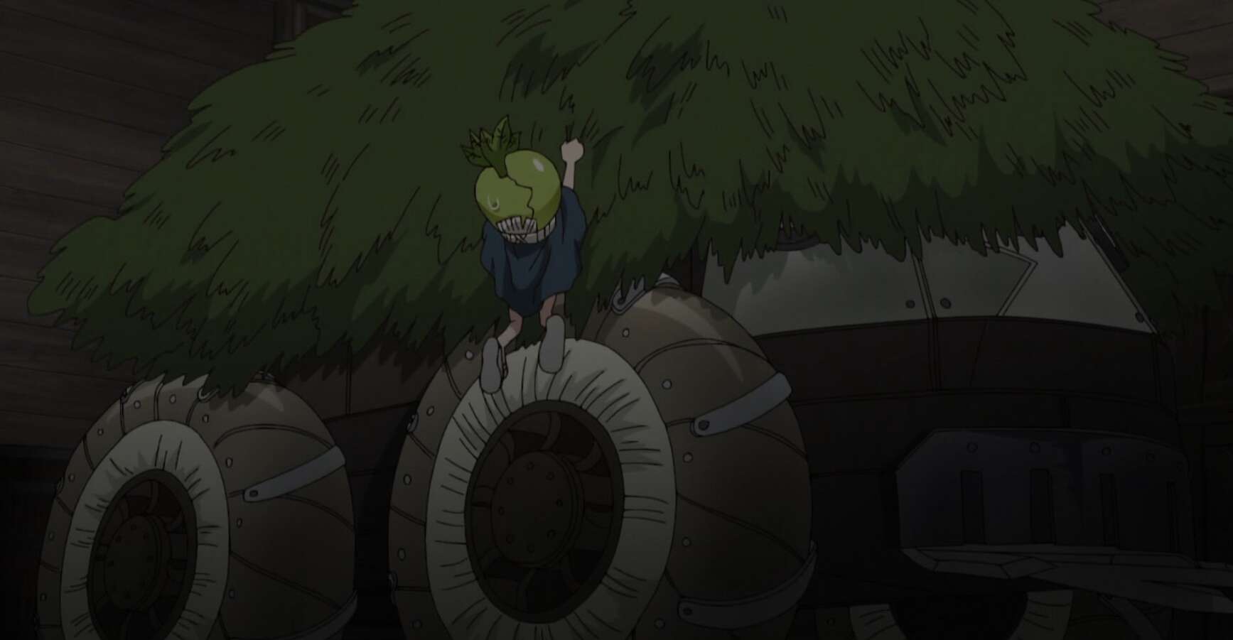 千空は島の人達の勘違いを利用しようと、腐った貝をジャスミンの花で包んで温め、ウ●コの匂いを作り出します。排気ガスに腐った貝とジャスミンの花の匂いを付け加えて、匂いを排出します。強烈なウ●コの匂いに島の人達は、ラボカーを生き物と思い込み、近づこうとしません。