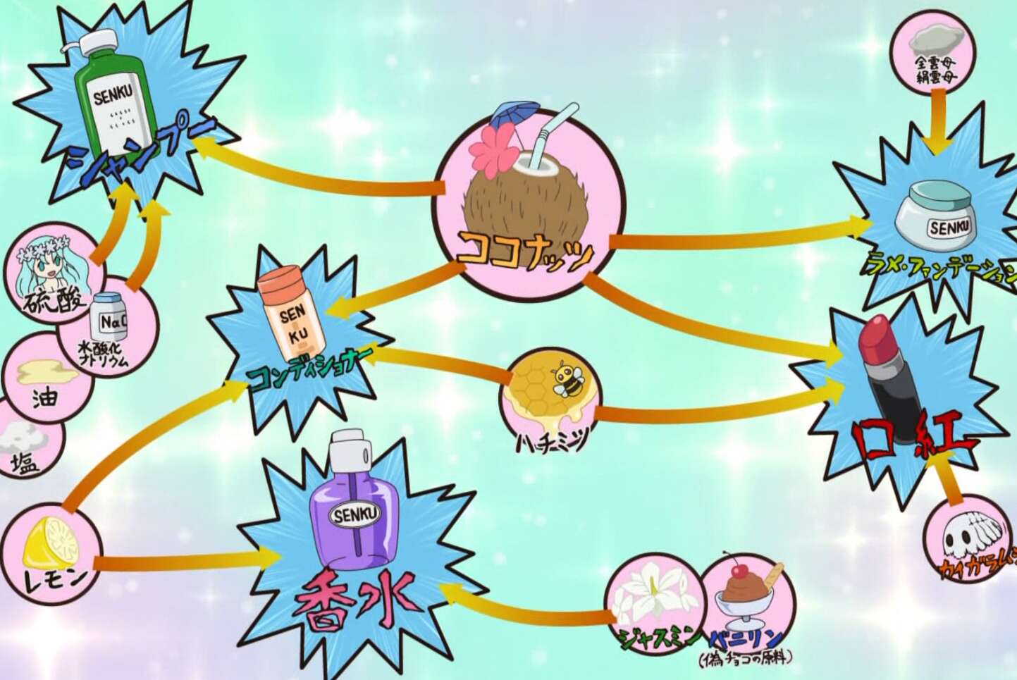 島の人達はウ●コの匂いのせいでラボカーに近づけず、ラボカーは大脱走に成功します。ラボカーをゲットした千空達は、アマリリスの案内で『サファイヤの洞窟』に身を隠します。千空はビューティーコハクの大改造を完成させようと、香水やシャンプー、コンディショナーを作り出します。