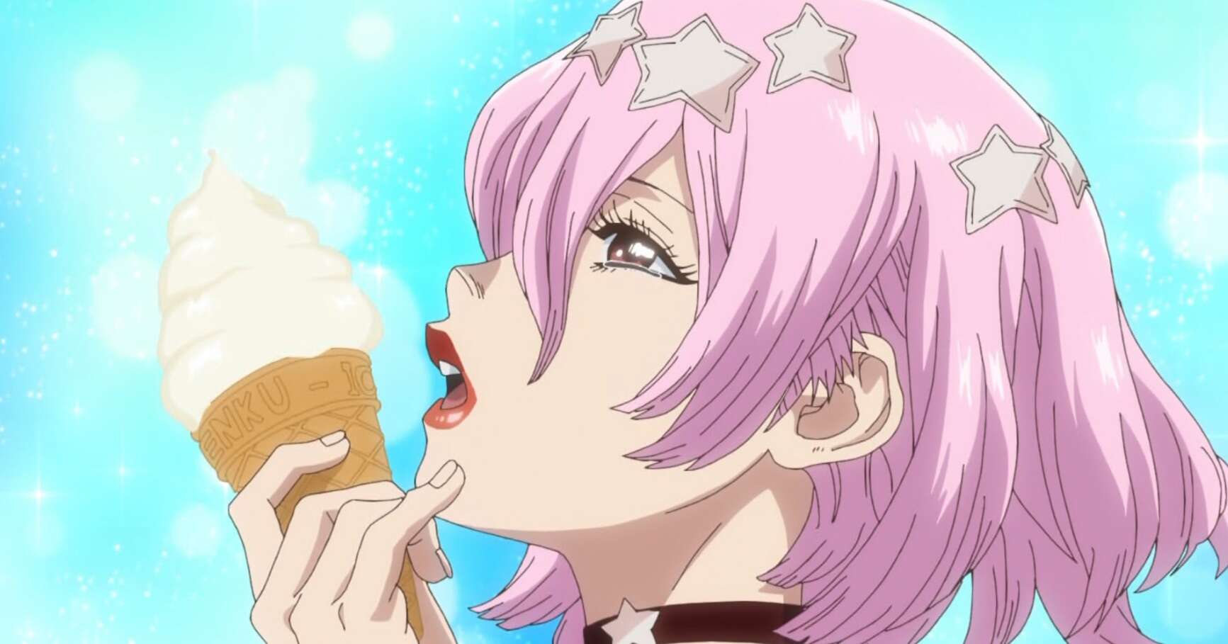 バニラエッセン、ミルク、砂糖、葛の根を冷やしながら良く混ぜて、千空はソフトクリームを完成させ全員に振舞います。ルーナは久しぶり食べたソフトクリームに感動します。