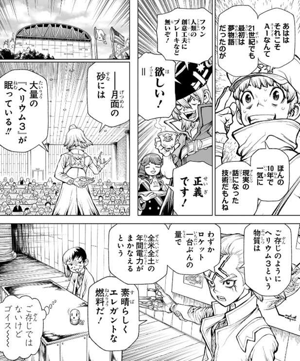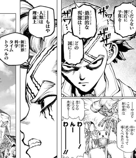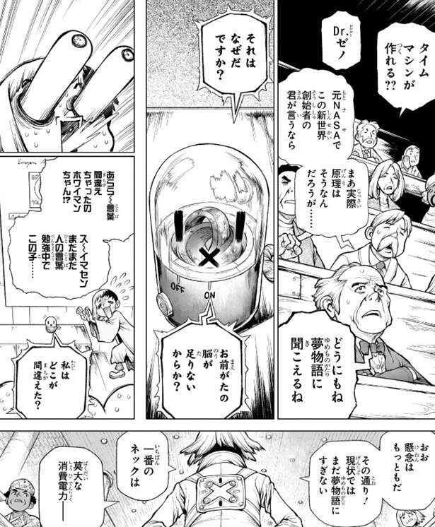 否定的な意見や、最終的な利権はどの国に属すのか、等の意見にゼノは怒り、この新世界は科学の武力をもって導くべきだった、と物騒なことを言い始め、ゲンに止められます。しかし、もはや人類は新世界化学タイムトラベルの、完全なる青写真まで創り上げたというのに、とゼノは言い、多くの科学者がタイムトラベルの実現を理解しないことを悔しがります。