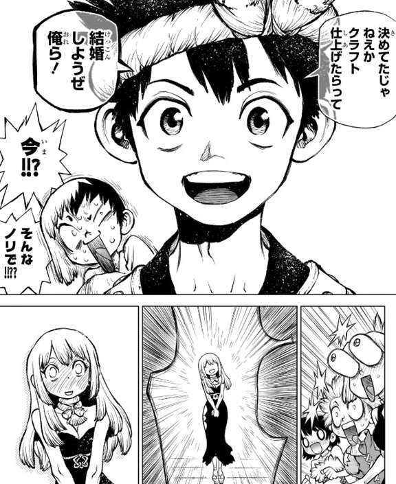 26巻の最終話でクロムがルリに言っていた、今のヤベー科学クラフト仕上げたら俺らも結婚しようぜ!と、言う自分の言葉をクロムは思い出し、タイムマシンの設計図が仕上がったので結婚しよう、とクロムはルリにプロポーズします。