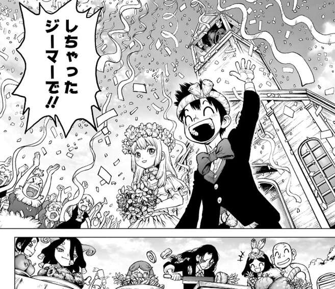 クロムとルリの結婚式には、石神村の住民だけでなく宝島の住民やアメリカのチェルシーやルーナ達も参加しています。ここで千空の恋バナになり、チェルシーは腺腔の相手はコハクかルーナのどっちかだと思っている、とズバッと思っている事を言ってきます。しかし千空は、んな時間もねえってよ、とあいまいな答え方をします。まだまだ、千空の結婚は先のようです…。ただ、既に千空はバツイチですが…。