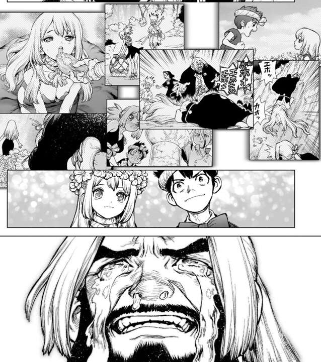 ゼノがラボにいる千空に会いに行くと、千空達はタイムマシンの設計図を完成させていました。クロムは、あと資源だけだろ、電力とかよ!?と、人類みんなで一歩一歩がんばれば行けると思っているようですが、ゼノや千空は複雑な表情です。流水達は、タイムマシンの設計図が完成したと聞いて、完成パーティーを開こうと騒ぎます。クロムは、完成した、祝いの儀、という単語を聞いて何かを思い出します。
