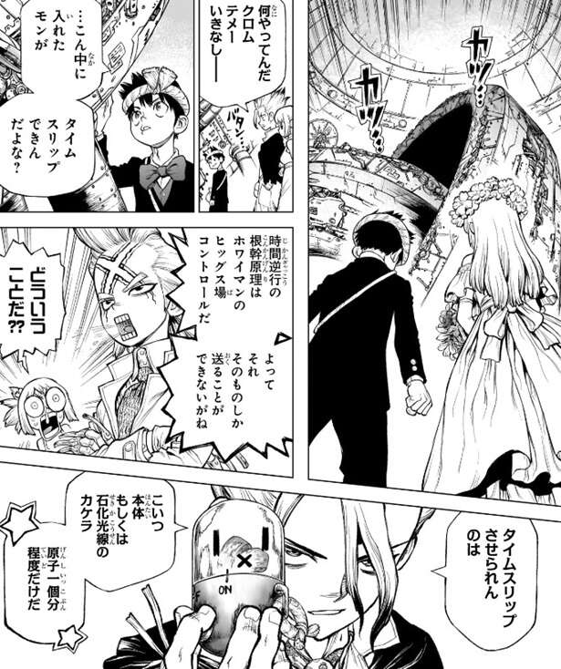 クロムは自分の結婚式の途中なのにラボに戻ると、建設中のタイムマシンを見上げて、この中に入れたものがタイムスリップ出来る事を確認します。時間逆行の根源理論はホワイマンのヒッグス場コントロールだそうで、つまりタイムスリップできるのはホワイマン本体か、石化光線のカケラ・原子一個分程度だけとなるそうです。