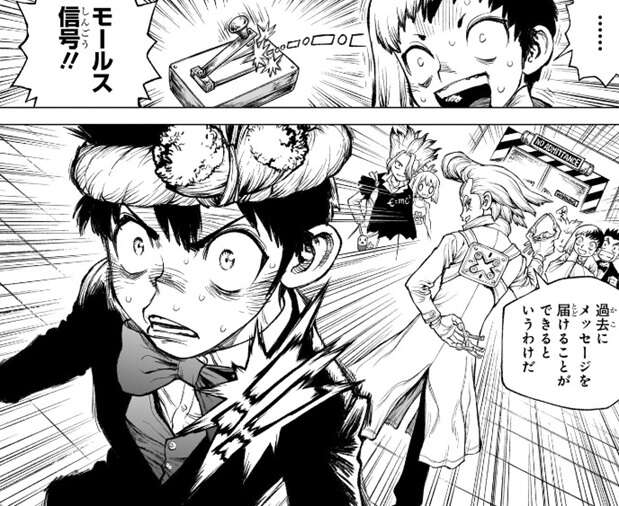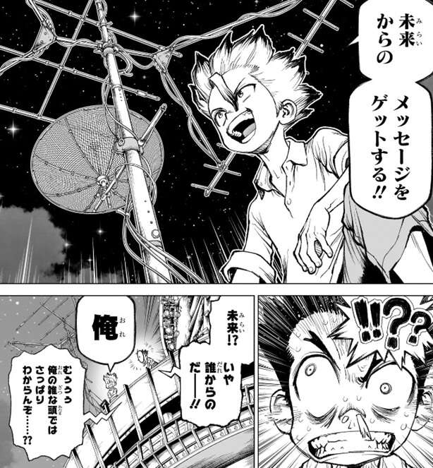 千空は10歳の頃に、アマチュア無線で未来からのメッセージをゲットする実験をしていました。未来の千空から10歳の頃の千空に宛てて、メッセージを送るというものですが、さっぱりわからんぞ……??と、大樹に言われています。