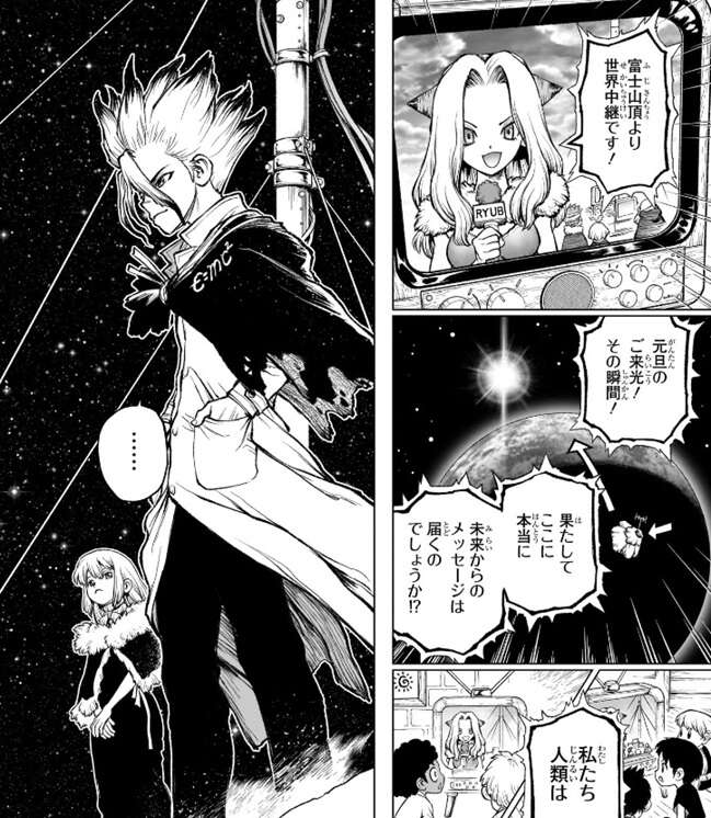 ゲンの言葉に千空は影響を受けたのか、クロムのアイデアを実行し元旦のご来光の瞬間に、富士山頂に未来からメッセージを送る、という約束を人類全体で決めたようです。未来でタイムマシンを完成させているか、未来からメッセージが送られてくるか、その瞬間を人類全体が待ち受けています。