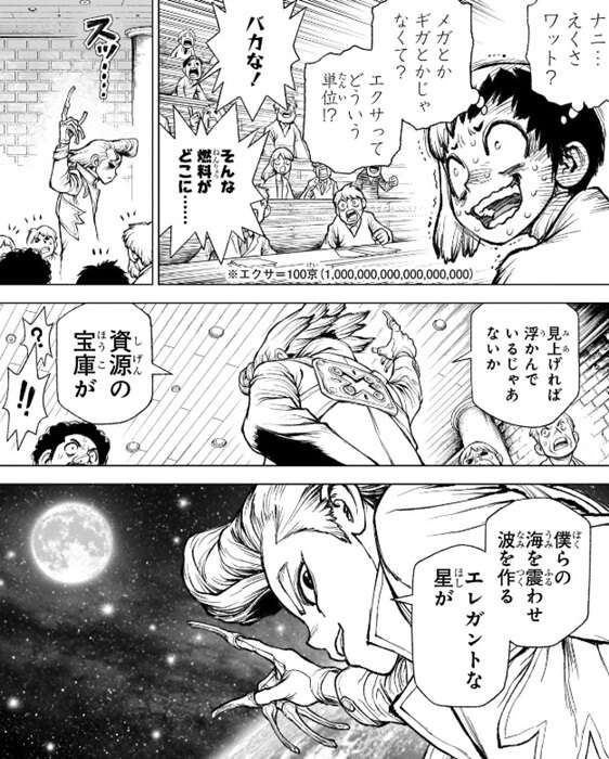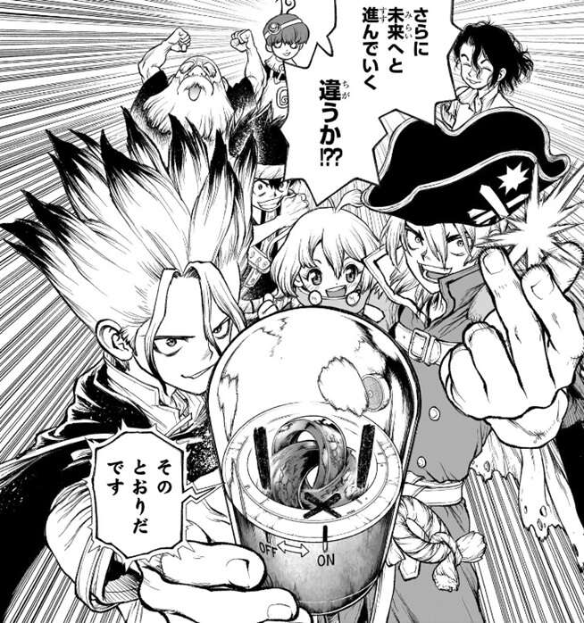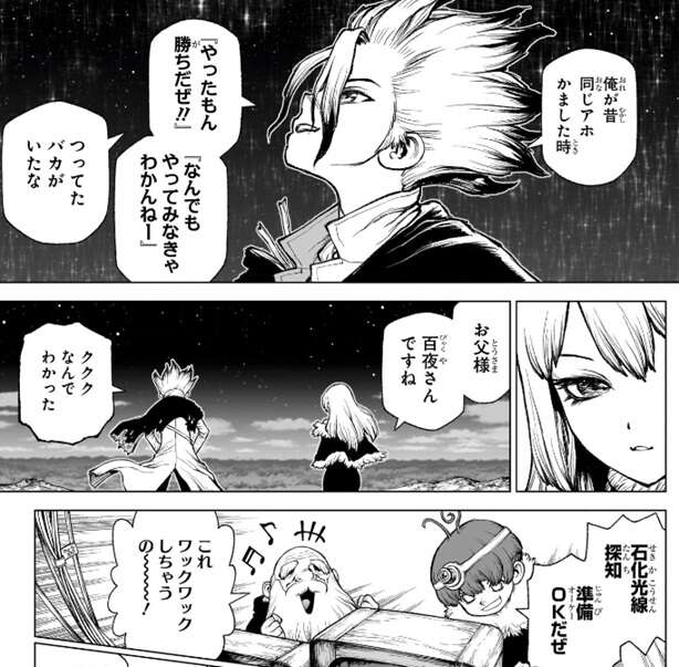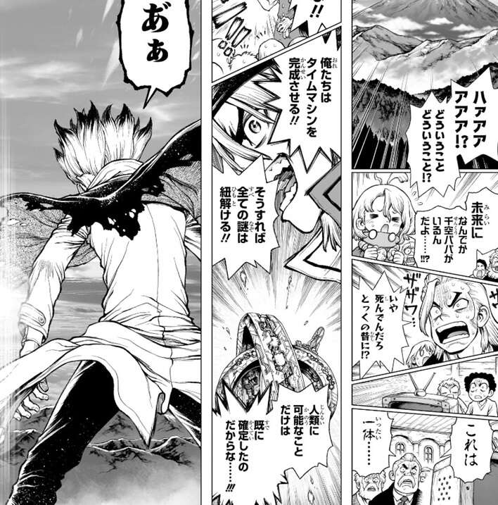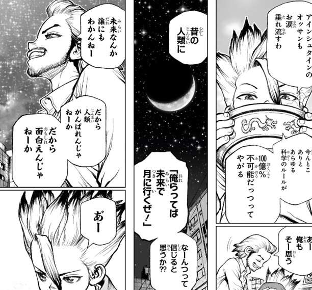 千空も、まあタイムマシンに関しちゃな無理ゲーすぎて、アインシュタインのオッサンもお涙垂れ流すわ、と言う通り、今の科学のルールでは100億%不可能だと分かっているようです。それでも百夜は、未来なんか誰にも分からない、だから面白い、と千空に言い、どんな知らねえ新化学が来んのか、と千空も答えます。
