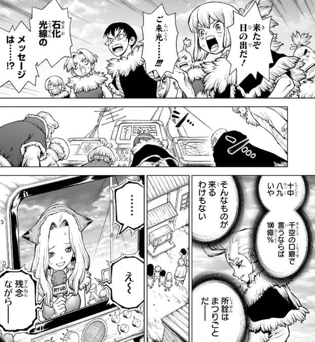 千空は富士山頂に作ったアンテナのそばで、10歳の頃に百夜から言われた言葉を思い返していました。カセキとジョエルは石化光線を検出できるように準備しています。SAIはモールス信号が英文、和文どちらでも来ても、リアルタイムで音声に変換できるようにプログラムを用意して待機しています。