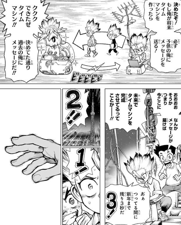 これは、千空が将来タイムマシンを作成できるかのテストで、もし千空が将来タイムマインを作ったら、必ず10歳の頃の千空にメッセージを送る、と今決めたそうです。つまりもし未来の千空がタイムマシンを完成させていたら、10歳の千空に向けて大晦日の今日、メッセージを送っているはずなので、今ここでメッセージを受信できるはずという千空の考えです。そしてカウントダウンが始まり、新年を迎えます。