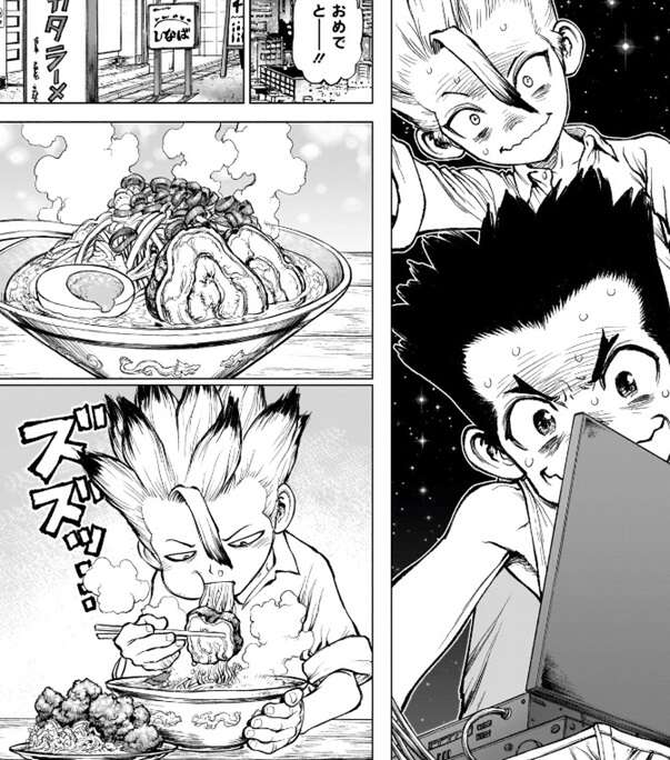 年が明けて街では新年のあいさつが行われています。千空は百夜と一緒にラーメン屋で食事をしていますが、浮かない顔です。結局、メッセージは千空には届かなかったようで、百夜に、天才なんだか小学生らしいんだかわかんねーアイデアだが……、と笑われています。千空は、未来からメッセージが送られても、今この世界線に届くのかというタイムパラドックス問題を引き合いに出して、完全に失敗したとは思っていないようです。