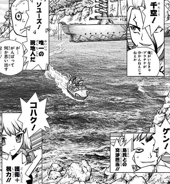 宝島の住民に気付かれず機帆船ペルセウスで島に接近できた千空達は、メンバーを最小限にした偵察隊で宝島を調査します。千空、コハク、ゲン、ソユーズの四人で偵察隊を組んで、石化復活液を無限に生産できるプラチナを探しに行きます。一方、機帆船ペルセウスに残った龍水や船員達は、船の清掃など雑用に取り組みますが、龍水は島から何者かの視線を感じます。
