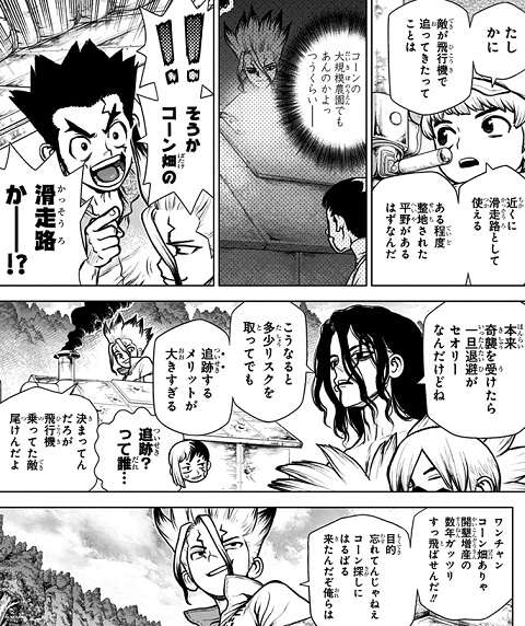 千空が即席で作ったアセチレンガスで敵の飛行機をエンストさせて、敵の撃退に成功します。飛行機を乗り捨てて逃走したので、乗り捨てた飛行機を奪取すると飛行機にはコーンの葉と粒が付着していました。この飛行機が使っている滑走路にコーン畑があると千空は推測し、敵を追跡してコーン畑があるか確認する事にします。