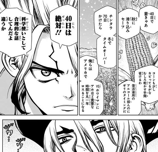 宇宙船を作る為の素材を世界中から集める為、まずはアメリカ大陸にコーンを求めて船で航海を始めます。太平洋を横断してアメリカ大陸に向かいますが、アメリカ大陸までのルートを巡って千空と龍水の意見が対立します。等角航路を使って70日をかけて進むルートを主張する龍水と、大圏航路を使って40日で進むルートを主張する千空は、お互い一歩も主張を曲げず決闘を行う事になります。