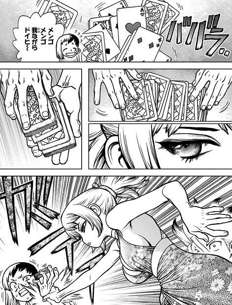 ポーカーでの決闘となり、龍水はゲンと、千空はコハクとそれぞれタッグを組んで決闘をします。確実なルートを望む龍水と、早く着くが難しいルートを狙う千空とでポーカーゲームを行いますが、周りのギャラリーも自分が勝つと思う方に賭けはじめ、ポーカーゲームは過熱していきます。ポーカーを始めると早速ゲンがカードにイカサマを仕掛けようと、怪しい動きをし始めます。