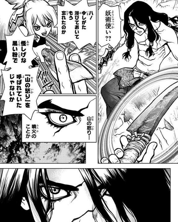 箱根に着いた千空、大樹、杠の三人は、温泉を堪能しつつ、火薬の素材、硫黄、木炭などを集めます。集めた素材を袋に入れ石で叩いて固めようとしますが、大樹が馬鹿力を使って大岩で叩いたため、集めた素材が火薬となってそのまま爆発を起こしてしまいます。予定外の爆発は起こってしまったものの火薬作成の実験は大成功で、千空達は爆発で起きた煙を消そうとしますが、その時誰もいないはずの方角から狼煙が上がります。