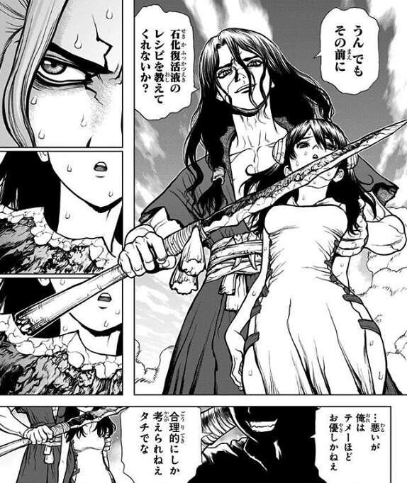 科学文明を永遠に捨てるとここで誓うように、千空は司から脅迫されますが、千空は子供の頃の父親との宇宙に行くという約束を思い出し、司の脅迫を頑なに拒絶します。司は千空が自分の脅迫に屈することはないと確信し、千空の頸神経を一撃で砕き殺害します。