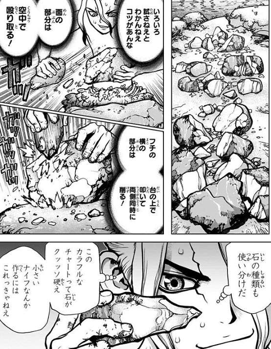 物語は全ての始まりである、千空が石化から目覚めたシーンへと遡ります。千空は目覚めると同時に、倒れていた位置を石で記録したり、体から剥がれた石片を確保したりと、いつでも検証できるように準備をしておきます。周りの状況から文明が滅んでしまったことを察した千空は、ゼロから科学文明を築くことを決意し、まずは石器を作ります。