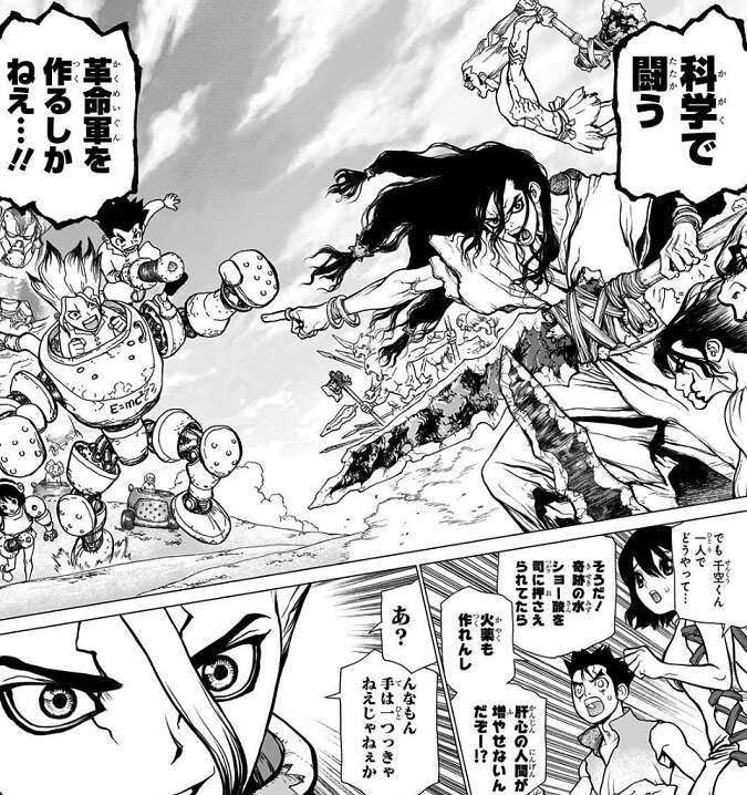 場面は再び現在に戻り、司に砕かれた千空の頸神経は石化解除時の修復作用で元に戻り、千空は再び復活します。千空は杠にあるミッションを託すと、杠と大樹に司の所にスパイとして潜入するように頼みます。杠と大樹に司の監視を頼むと、千空は単独行動で、科学で闘う革命軍、科学王国を作る事を決意します。