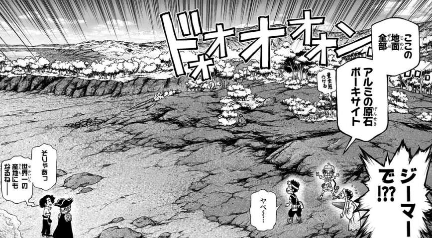 エンジン作りをゼノ達に、コンピューター作りをコーンシティ組に任せて、千空達は月旅行計画のロケット本体に着手します。まずはメイン素材のアルミニウム、その素材のボーキサイトを手に入れるためにオーストラリアを目指します。オーストラリアに到着した千空達はすぐにボーキサイトを大量に入手し、さらにコーンシティから大量の食糧が届きます。