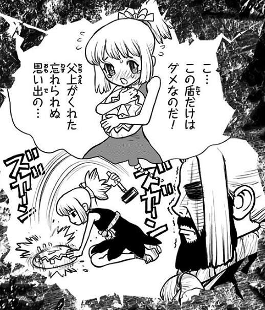 Z=52でコハクが千空に提供した盾ですが、優勝記念の盾で父親からコハクに送られています。父親にとっては思い入れが結構あったようですが、無情にもコハクには全くなかったようです。本当は、父親はこんな感じの反応が欲しかったようです。
