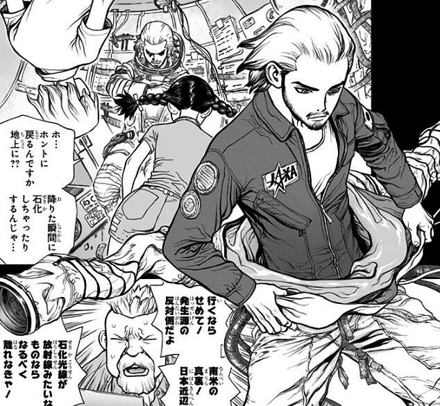 人類が謎の光によって全員石化していた頃、宇宙ステーションにいる千空の父親・百夜は地球に帰還することを決意します。SNSの平均最終書きこみ時刻から、謎の光の発生源を南米と特定した百夜達は、地上に戻る場所を南米の真裏・日本近辺に決めます。