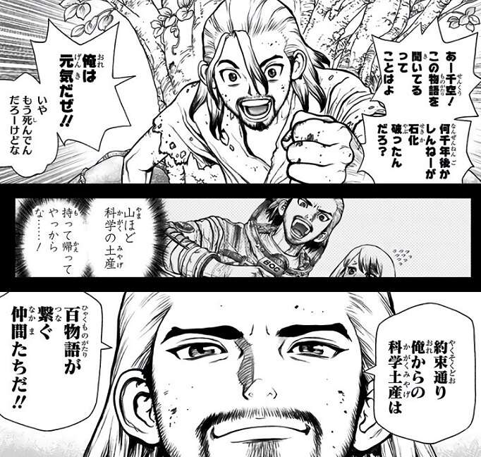 ルリが話してくれた伝承話によって石神村の住民全員が、かつて宇宙ステーションにいて助かった千空の父親・百夜を含む6人の子孫だと分かりました。またルリが千空だけに話した「百物語 其之百 石上千空」、この物語の内容は、文明を作り上げて全人類を救い出す、お前なら必ず…、という百夜から千空に向けたメッセージでした。