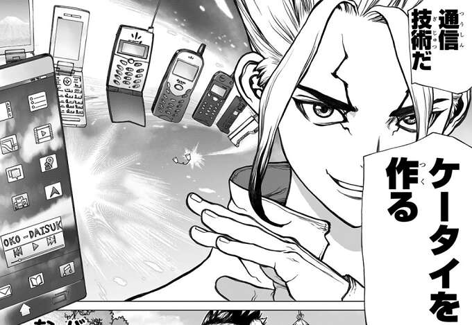 司帝国は次に攻めてくる時は、帝国の総力を挙げた精鋭大部隊で来ると千空は予想し、次の戦いに備え、人類200万年最強の武器・ケータイを作ろうとします。司帝国にいる大樹&杠を内通者として、通信技術で戦力差をひっくり返せば、司帝国の無血開城も夢ではありません。
