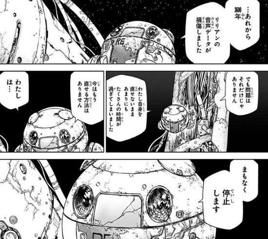 前半は、千空の父親 百夜がISSから地球へどうやって帰還したかの経緯が描かれていて、後半はISSに残ったロボット レイのその後が描かれています。