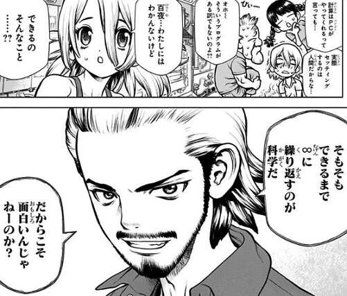 そして地球上の全人類が石化した日、百夜はISSにいて石化から難を逃れます。百夜はISSにいた五人に、全人類を助けに行こうと言いますが、ヤコフから、もし…地球に帰還するのに失敗したら?今度こそホントに人類絶滅じゃない!と地球帰還に反対されます。