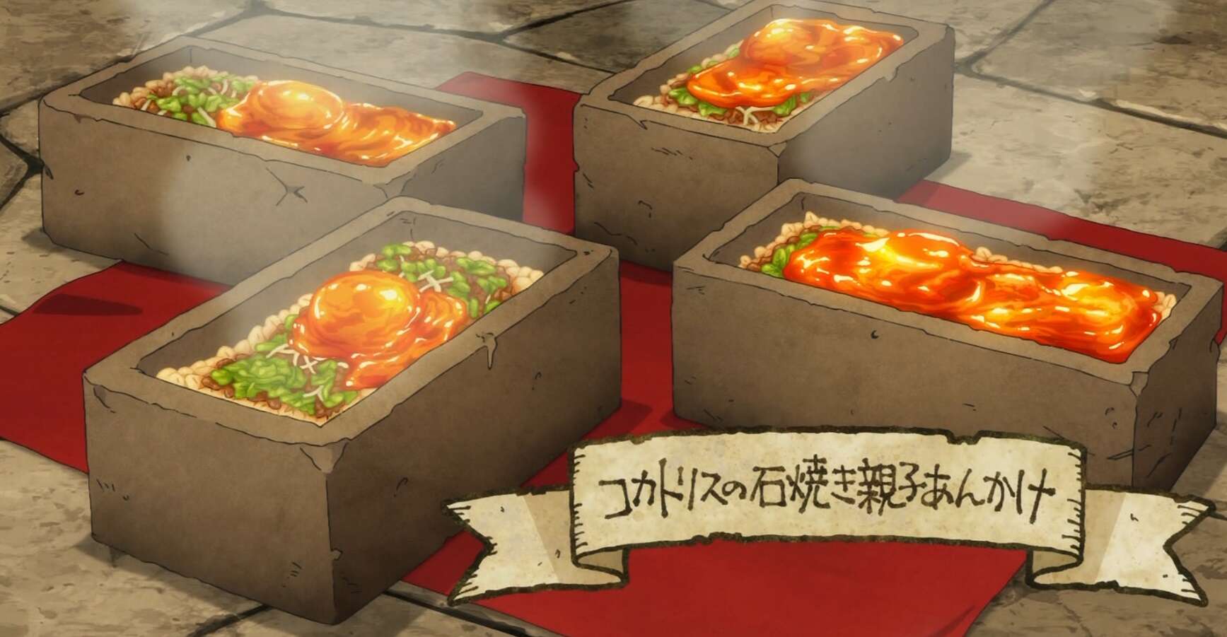 センシはコカトリスのバラ肉、ドライアドの実、石化消し草の葉、マンドレイクの実と葉、コカトリスの卵などを使って、コカトリスの石焼き親子あんかけを調理、完成させます。さらに、料理の皿にはダンジョンクリーナーで出来た石を使っています。