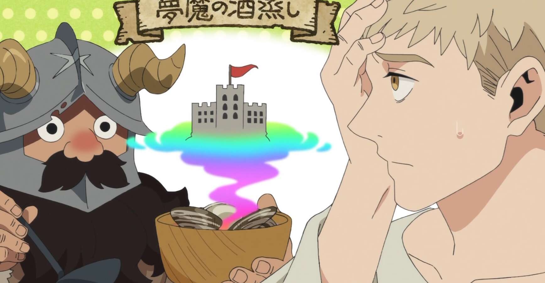 目を覚ましたライオスは、同じく目を覚ましたマルシルの枕から貝のような姿をしてる魔物・ナイトメアを取り出します。センシは溶かしたバターの上にナイトメアを並べ、ワインで蒸してナイトメアを調理します。ナイトメアの酒蒸しが完成すると、ナイトメアが食べたマルシルの夢が蜃気楼となって現れます。