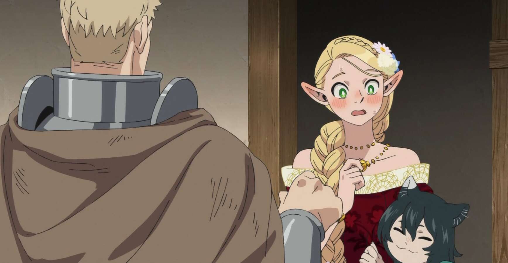 ライオスとセンシが家に戻ってくると、マルシルとイヅツミは奇抜でない別のドレスを着ていました。この場所には大量の結界が何重にも張られていて、結界の影響かイヅツミが幼児退行したように大人しくなっていました。