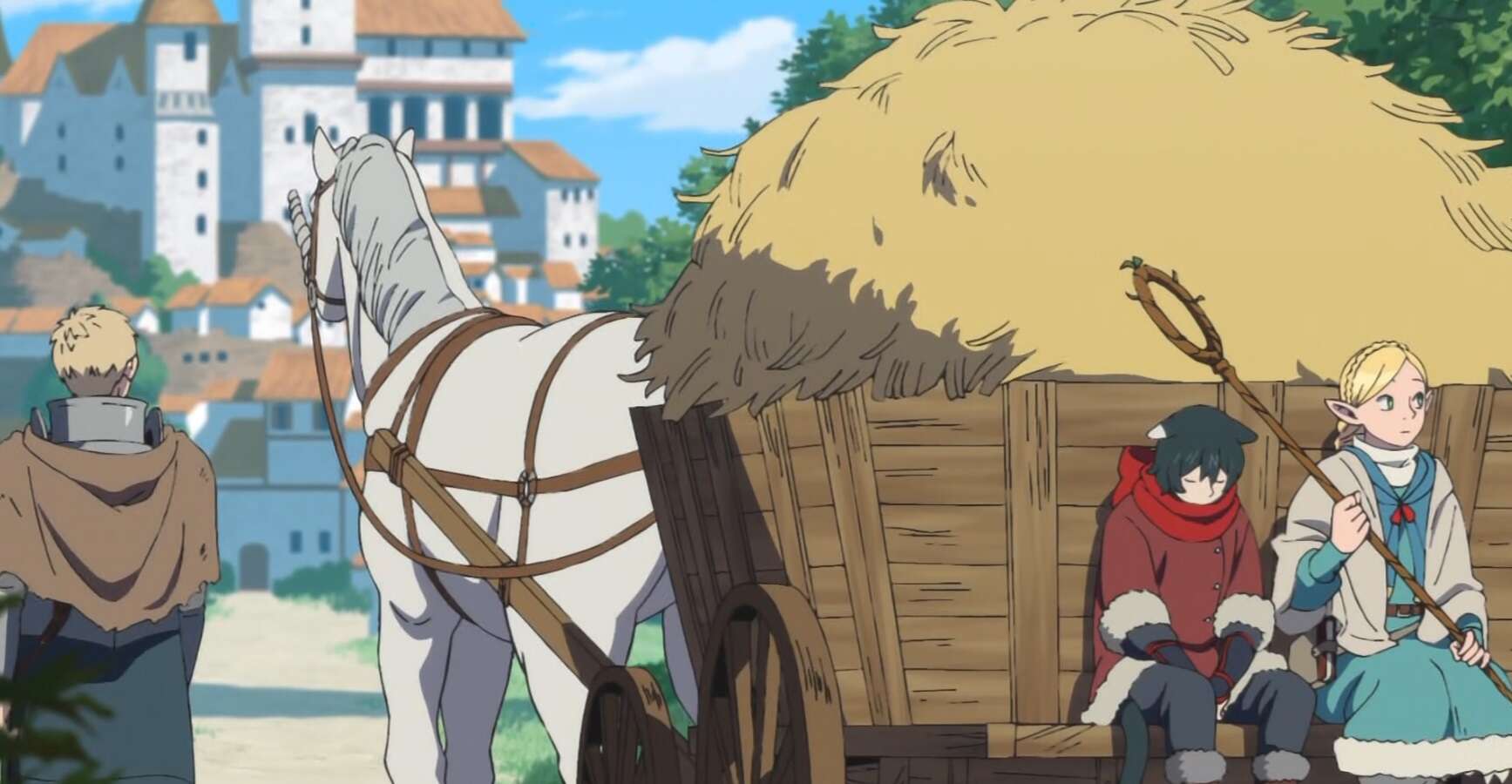 ライオスは助けてもらった礼を言うと、幽霊は紹介したい人がいると言い、ライオス一行をどこかに転移させます。幽霊に転移させられた場所は、遠くに黄金城が見える村でした。その村では魔物が家畜の様に住人に飼われていて、魔物達も大人しく、住人に聞くと魔物達は住人を傷つけないように命令されているそうです。