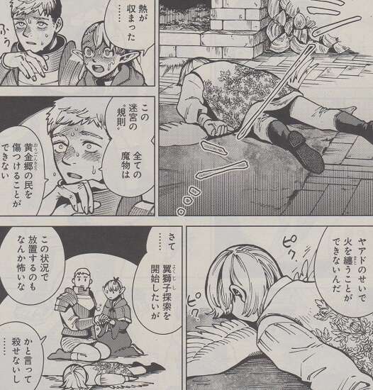 眠っている人たちが気になりますが、とりあえずライオス達は翼獅子を探すことにします。が、ざっと見た感じですが翼獅子の姿は影も形もありません。囚われているって多分私たちが考えてるような形じゃないね、とマルシルは言い例えば鏡、水晶、本、巻物などに封印されている可能性の方が高いとマルシルは話します。そんな会話をしていると、暖炉の方から何か音が聞こえてきます。