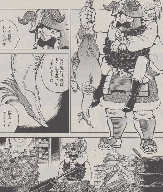 動けないとはいえフェニックスを放置できないとライオスが悩んでいると、もう一つの規則である他の生き物に完全に消化されたところで生き返る権利を失う、という事を利用してフェニックスを生き返れないようにしようと、センシはフェニックスの調理を始めようとします。しかしセンシは荒れ放題の厨房を見て、こんな厨房では料理が出来ないと掃除を始めます。