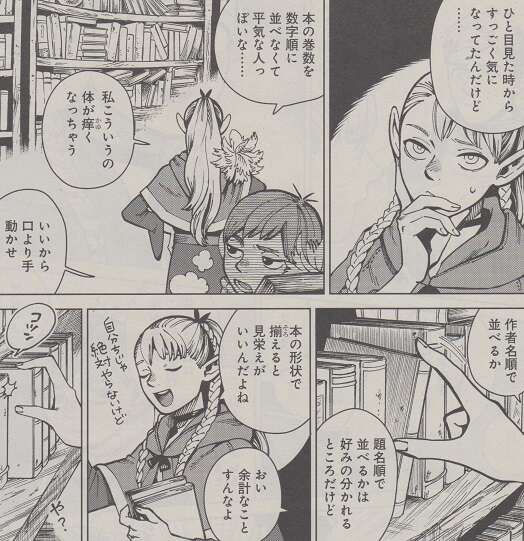 早速皆で片付けに取り掛かりますが、本の巻数を数字順に並べなくて平気な人っぽいな…、私こういうの体が痒くなっちゃう、と狂乱の魔術師とは性格が合いそうにない事をマルシルは言います。そんなことを話ながら片付けていると、マルシルは本棚の奥で何かを見つけます。