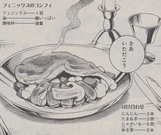 こうして、フェニックスのコンフィが出来上がります。発火する食材ははじめてだったが、温度管理もしやすく楽しかった、とセンシはフェニックスの調理は楽しかった、感想を言います。油で煮込まれた鶏肉はとてもおいしそうで、ライオスもフェニックスを食べれるので満面の笑みです。