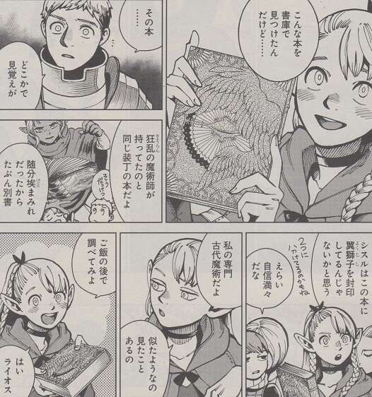 罪悪感にかられるマルシルですが、ある本を書庫で見つけた事を思い出しその本をライオスに見せます。その本の装丁はシスルが持っていた本にそっくりで、マルシルはこの本に翼獅子が封印されているのでは、と考えます。