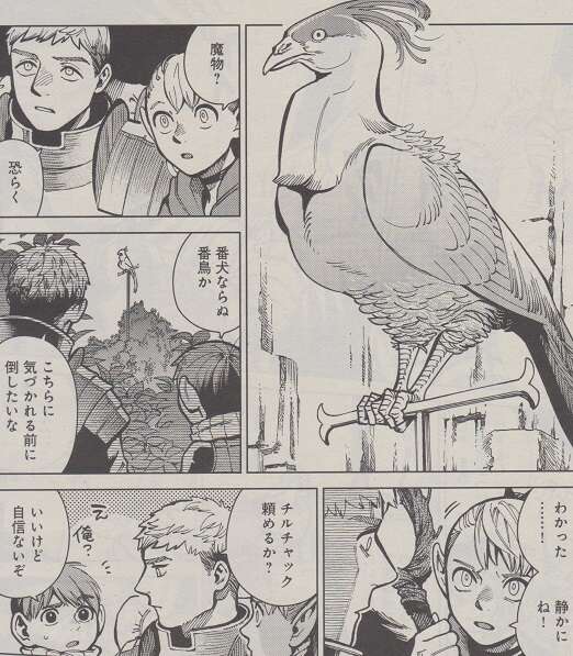 チルチャックの弓矢は鳥の首辺りを貫通し、鳥の魔物を気付かれずに倒せました。鳥を倒せたライオス達は、家の中に入ろうとしますが中の光景を見てライオスは思わず声を上げてしまいます。