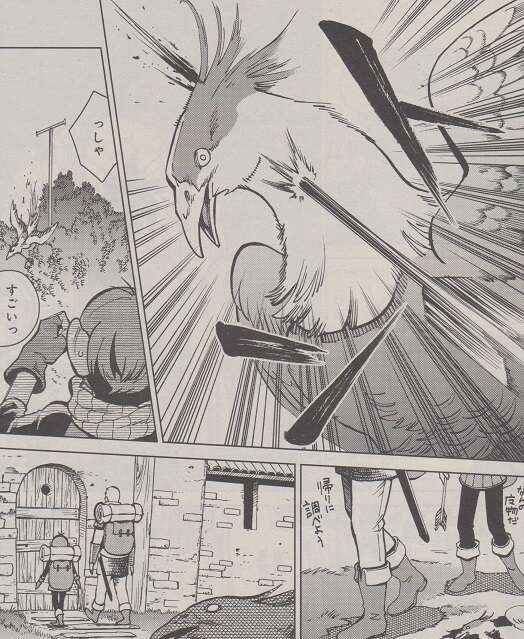 鳥の魔物の攻撃を剣で受け止めますが、鳥の魔物は突然燃え上がり熱を帯び、ライオスの剣にも熱が伝わります。頭突きで鳥の魔物をひるませた隙に、鳥の魔物を剣で切り裂いて倒しますが、剣に伝わった熱のせいでライオスの手のひらの皮がただれています。