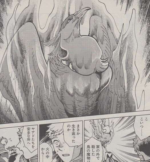 マルシルはライオスの怪我の手当てをしようとしますが、そんな余裕はない、とライオスは言い倒したはずの鳥の魔物を警戒します。暫くすると鳥の魔物はまた燃え始めて、古い体を燃やし、火の中から新しいからで生き返ろうとします。