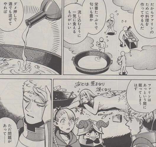 だからファリンのために料理を作り、流し込むように一気に食えるような料理に、さらにダメ押しで酒でも混ぜてやれば、ファリンはあっという間に眠ってしまうはず、とライオスは皆に話します。