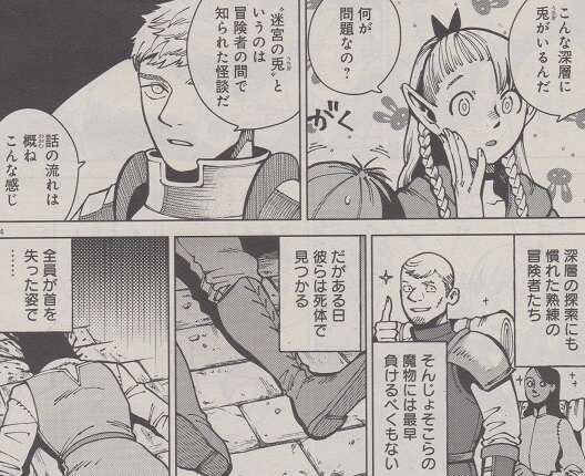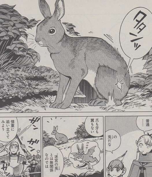 が、ここで問題があって料理の為の食材をすぐに用意する必要がありますが、その心当たりの食材とは兎だ、とライオスは言います。兎の糞が家の前にころがっていたからですが、ここでライオスは迷宮の兎という、冒険者の間では知られた怪談の話をします。深層の探索にも慣れた熟練の冒険者たちでも、全員が首を失った姿で全滅するほど、迷宮の兎は強いそうです。