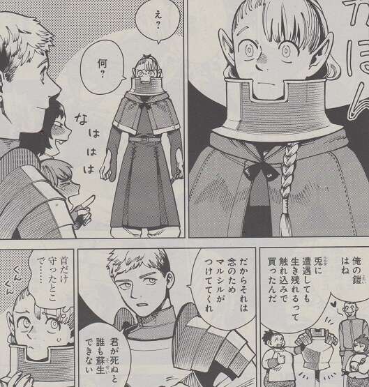 それを聞いたマルシルがめちゃくちゃ強い兎を想像していると、ライオスが念のためと首部分の鎧を貸してあげます。ライオスの鎧は兎に遭遇しても生き残れるという触れ込みで買ったものだそうで、念のためマルシルがつけててくれ、君が死ぬと誰も蘇生できない、とライオスは言います。