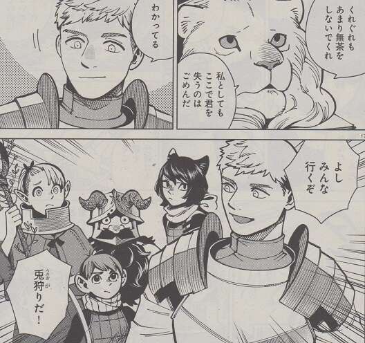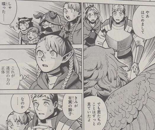 あとどれくらいでファリンはここへ到着する?とライオスが聞くと、半日というところだろう、と有翼の獅子は答えます。半日で狩りから料理まで出来ると判断したライオスは、有翼の獅子からあまり無茶をしないでくれ、と注意を受けた後兎狩りへ行きます。