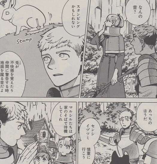 ライオス達が家の前で兎を探していると、タン!という音が聞こえてきます。ライオスは、兎が不快感を覚えたり、仲間に警告する時に地面を蹴る音、スタンピングかも知れないと言い、センシとイヅツミと共に音が聞こえた方を調べに行きます。