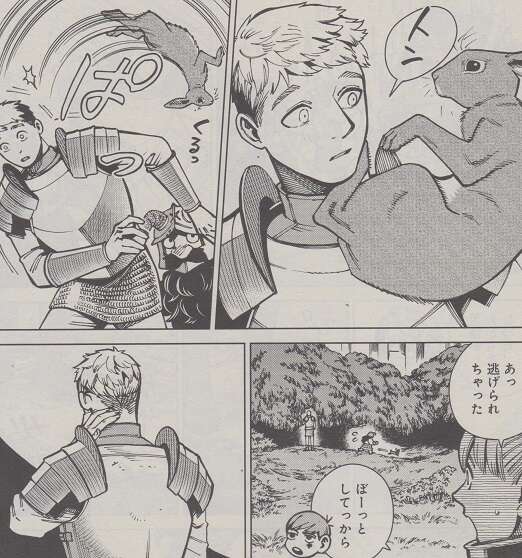 すると普通の兎が見つかります。爪も牙も翼もない、迷宮の兎とは無関係そうな兎ですが、ライオスは慎重に追い立てていきます。ライオス達が出す音を聞いて、兎は逃げ出しますがライオスは足跡をたどって追いかけます。