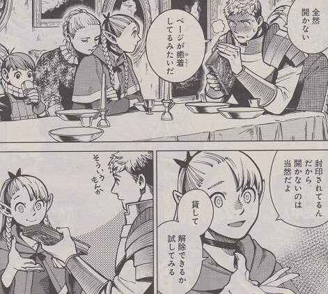 マルシルが狂乱の魔術師 シスルの家で見つけた本、この本に翼獅子が封印されていると推測し、ライオスは力ずくで本を開けてみようと頑張りますが全く開きません。マルシルは、封印されていると開かないのは当然、と言い本を解除できるか試してみると言います。