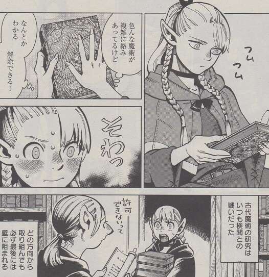 マルシルは昔から古代魔術の研究に取り組んでいましたが、いつも検閲の壁に阻まれていて、核心に迫る為に迷宮に行こうと決めた過去があります。そして、この本の中身こそ古代魔術の核心と思われ、ようやくここまで辿り着けたとマルシルはソワソワしてしまいます。