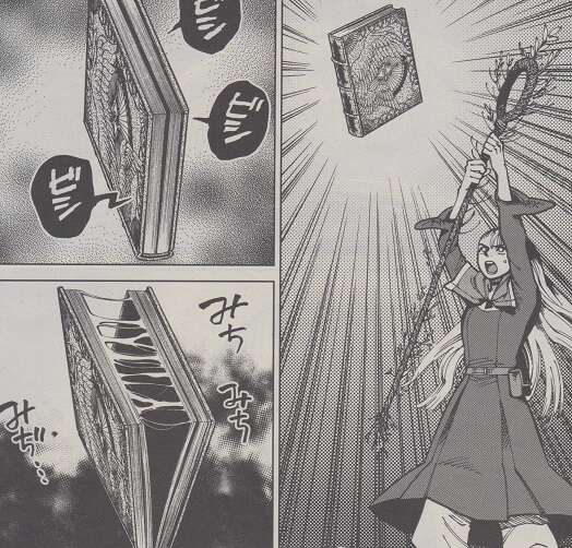 マルシルの杖、アンブロシア(イヅツミが名前にあきれています)で本を覆う分厚い魔力の封を吸い上げ、薄くなったところを一気にこじ開けて本の封印を解除しようとします。